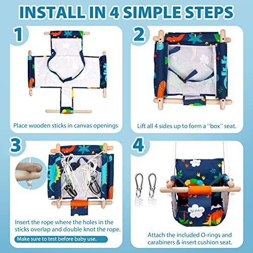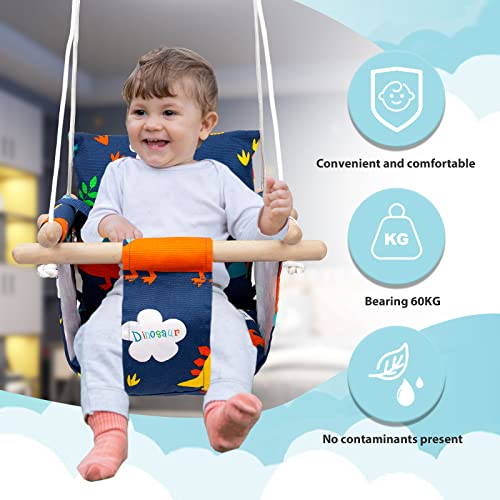 Katomi Schaukel für Baby Kinder mit Sicherheitsgurt Edelstahl Karabiner Weichen Kissen bis 50kg Zulässig Längenverstellbaren CE Umwelt Stoff Dinosaurier-Muster für Garten In- Outdoor