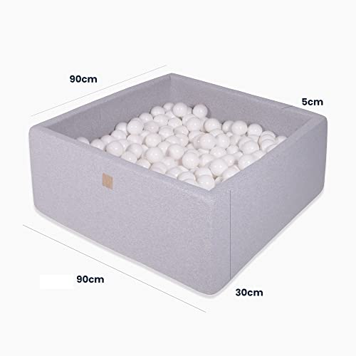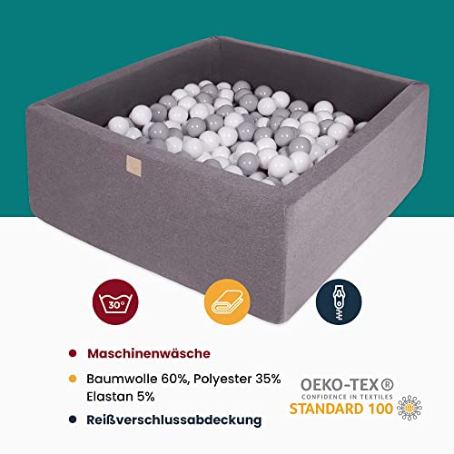 MEOWBABY Bällebad Baby – Quadrat 90x90x40cm Baby Pool für Kinder mit 200 Bälle, Baumwolle, Hellgrau: Türkis/Grau/Weiß